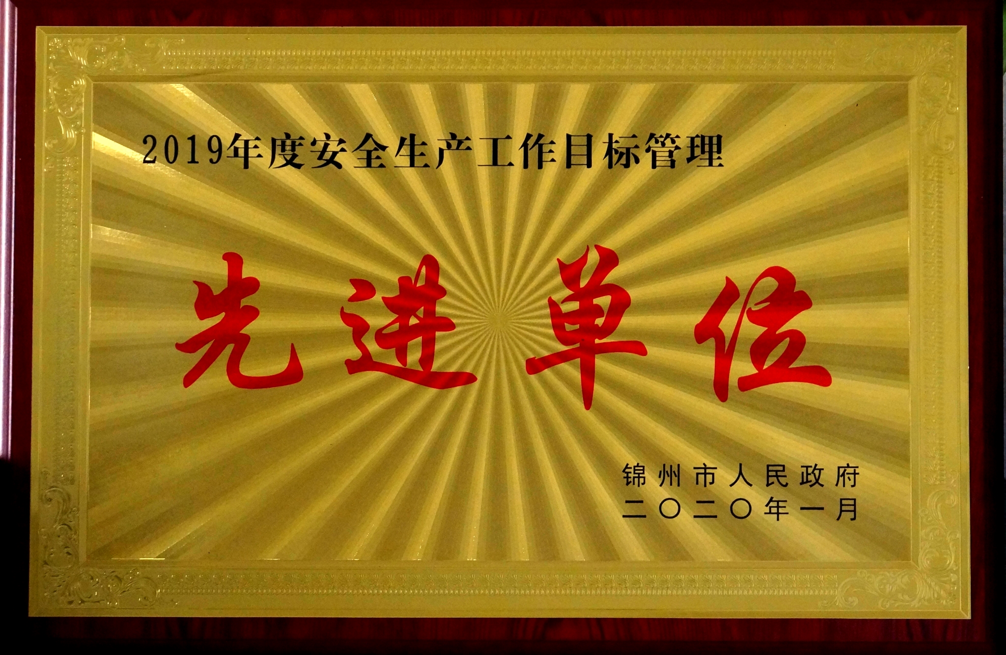 公司被錦州市政府授予“2019年的安全生產(chǎn)工作目標(biāo)管理先進(jìn)單位”榮譽(yù)稱號